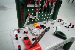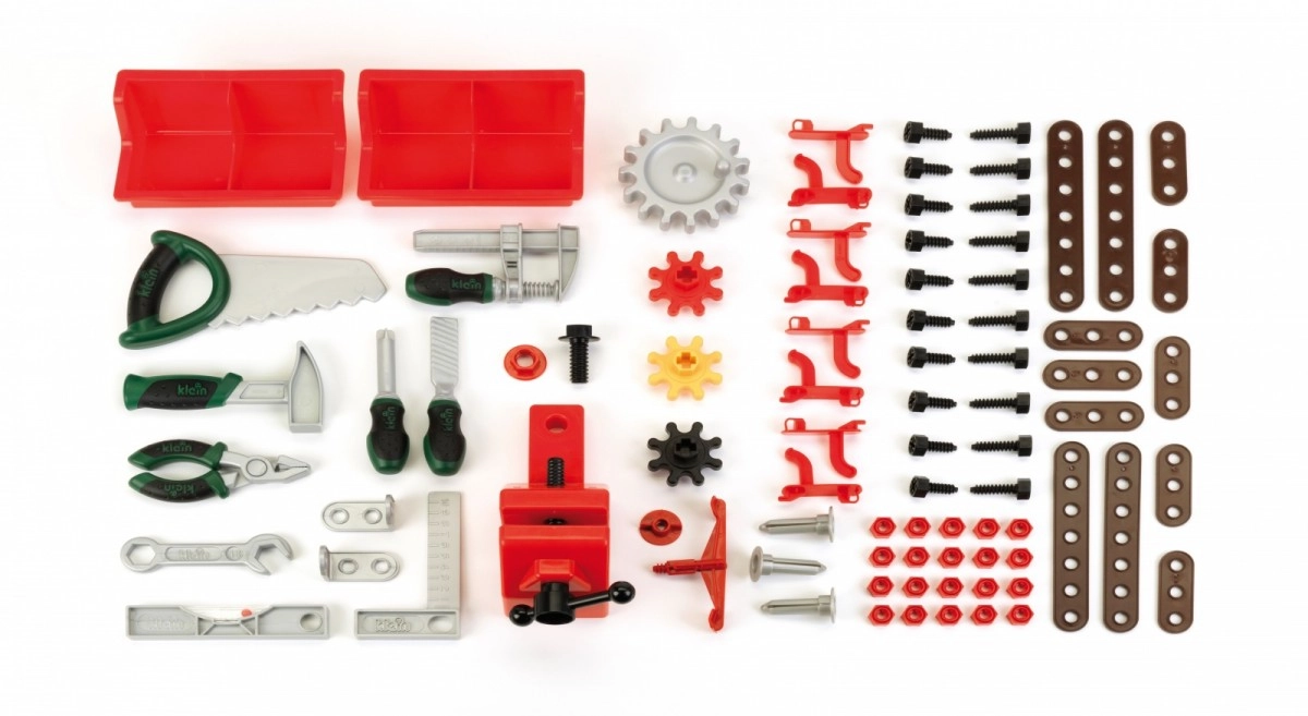 Kompletne wyposażenie, w tym śrubokręty, klucz, poziomica, szczypce, pilnik, młotek, piła, kątownik, śruby, nakrętki i listwy konstrukcyjne. Dzieci mają wszystko, czego potrzebują do pierwszych projektów i nauki przez zabawę.