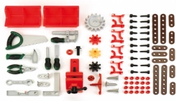 W zestawie znajduje się bogaty komplet wysokiej jakości akcesoriów: śrubokręt płaski i krzyżowy, klucz, poziomica, szczypce i pilnik, a także młotek, piła, kątownik, śruby, nakrętki i listwy konstrukcyjne. Dzieci w zabawny sposób ćwiczą małą motorykę, koordynację oraz logiczne myślenie podczas łączenia listew i wkręcania.