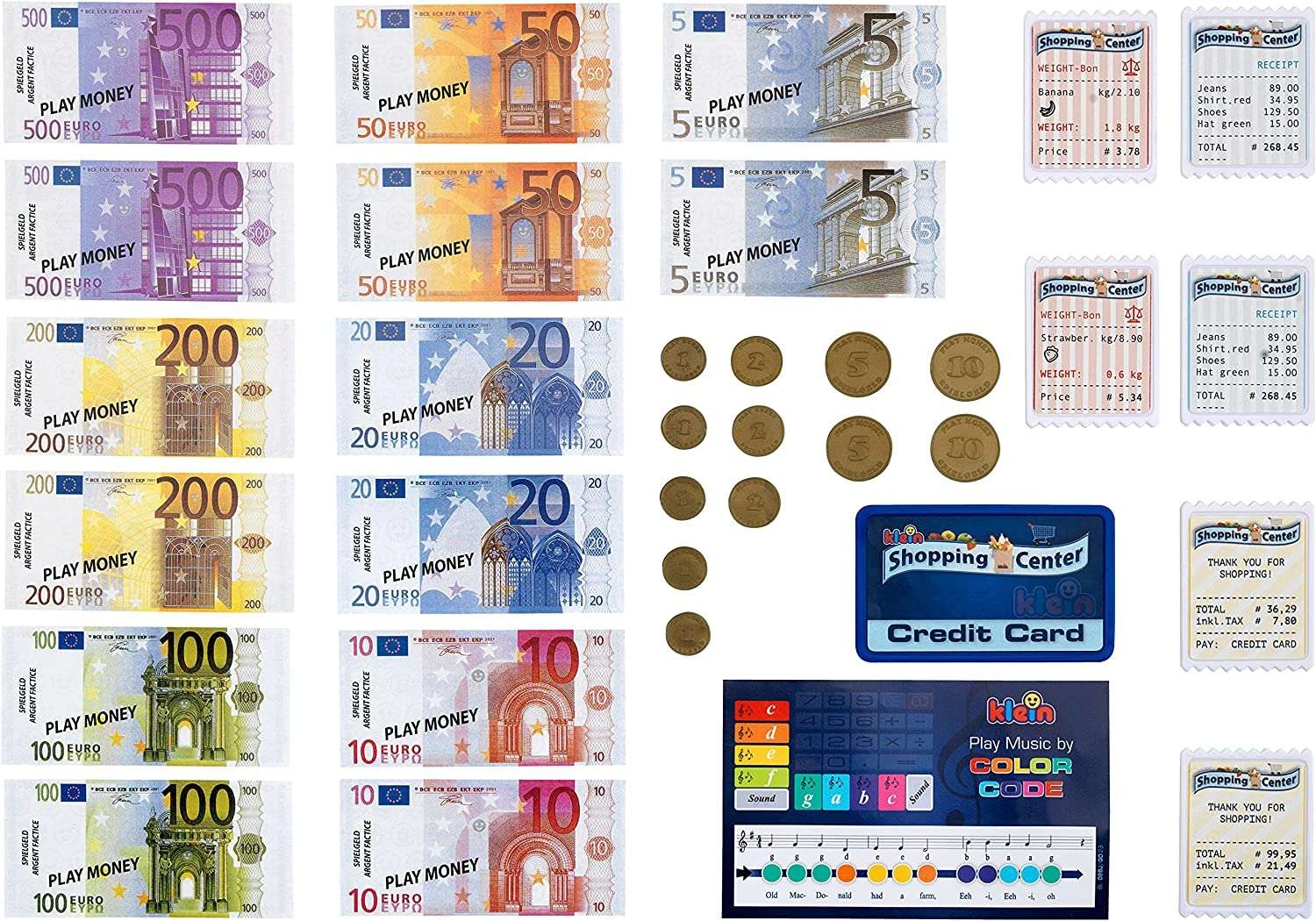 Zestaw zawiera kartonowe monety, papierowe banknoty, kilka paragonów, kartę płatniczą oraz kartę z piosenkami – wszystko do kompletnej zabawy w sklep.