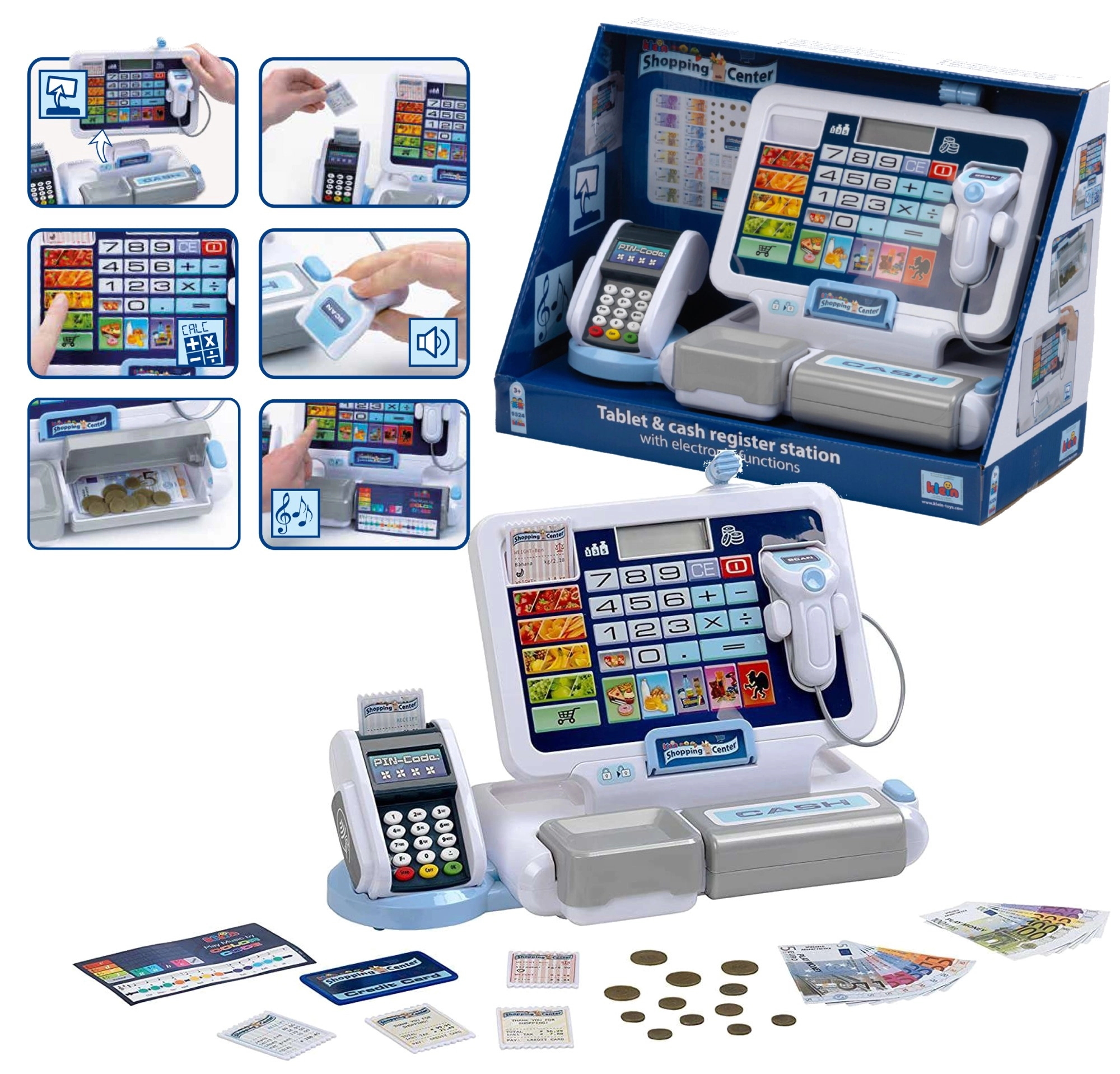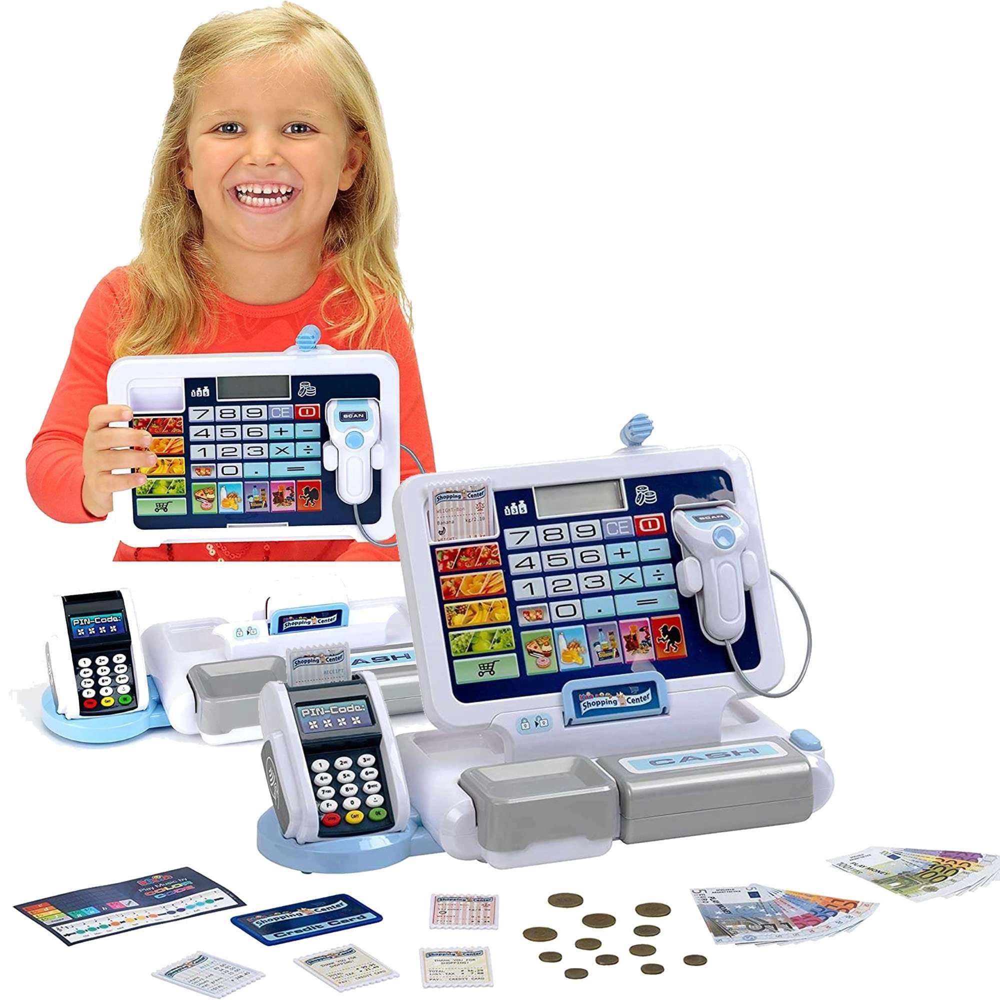 Realistyczna dziecięca kasa z terminalem i skanerem marki KLEIN zapewnia autentyczną zabawę w sklep. Oferuje działający wyświetlacz z kalkulatorem, otwierany szufladę na pieniądze, czytnik kart, efekty dźwiękowe oraz bogate akcesoria, w tym monety i banknoty euro, paragony oraz „kredytową” kartę – idealna do rozwijania liczenia, kompetencji finansowych i zabawy w odgrywanie ról.