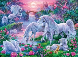 Idealny wybór do samodzielnej zabawy i wspólnych chwil z rodziną. Motyw jednorożców na tle ciepłego zachodu słońca zachwyci wszystkich małych miłośników fantazji i zapewni godziny zabawy.