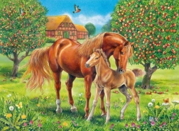 Zabawna układanka dla dzieci z motywem pięknych koni na łące oferuje 100 dużych elementów dla łatwego składania.