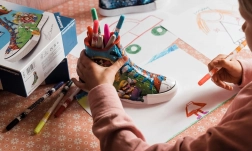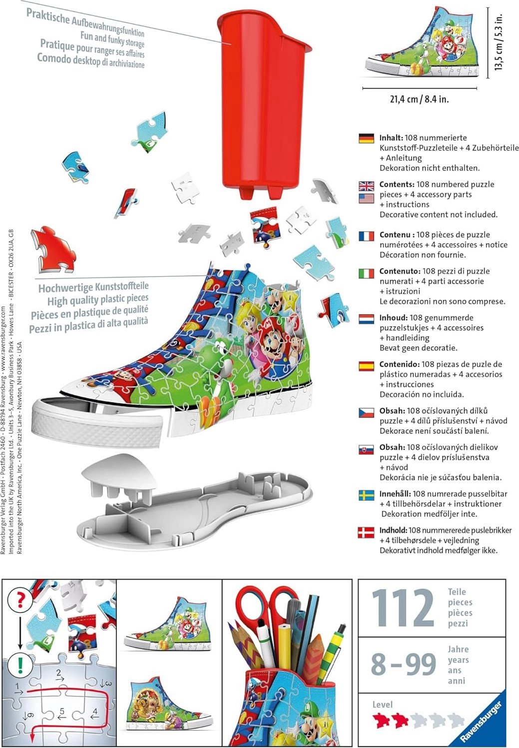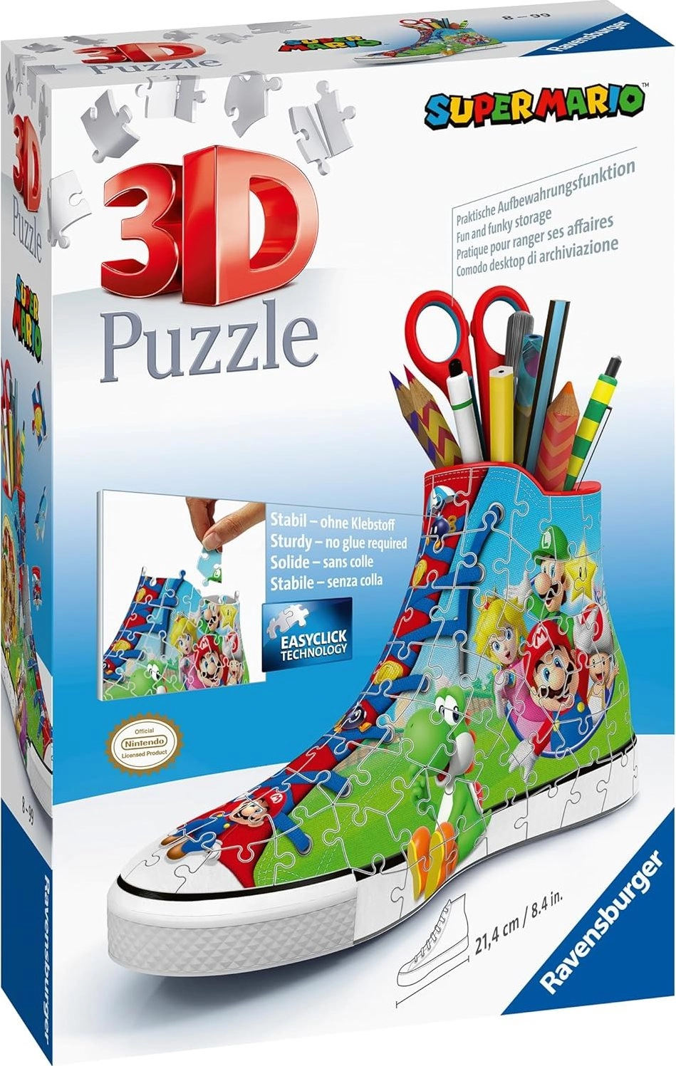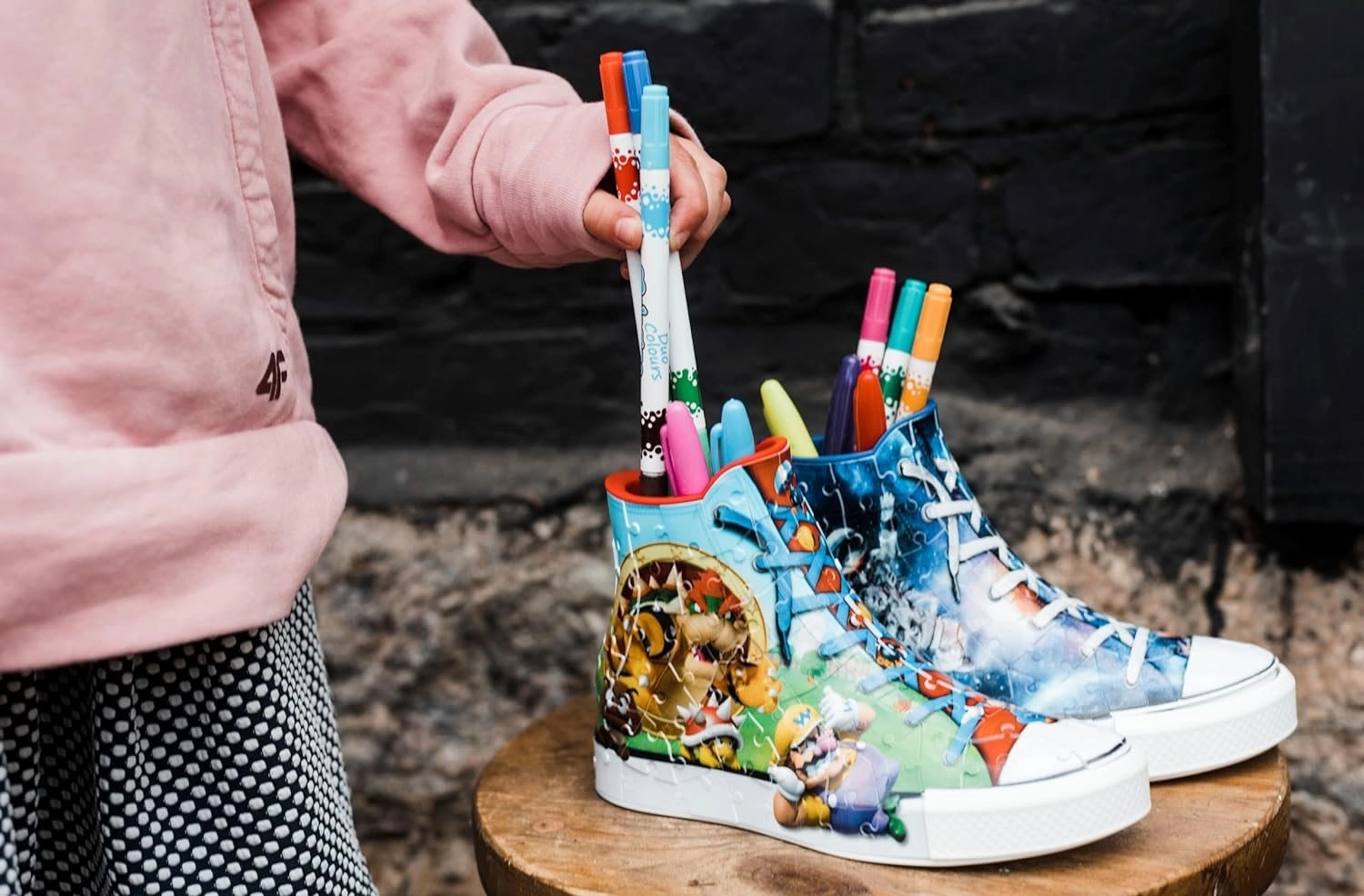 Złóż z 108 plastikowych elementów puzzle tę klasyczną trampkę z motywem Super Mario i zyskaj świetną dekorację do pokoju! Po ułożeniu czeka na ciebie dodatkowy bonus: możesz jej używać na pędzle, ołówki itp.