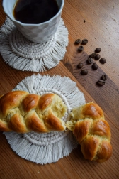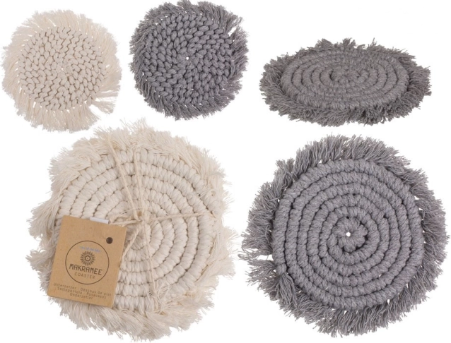 Odkryj stylowe makramowe podkładki, które łączą funkcjonalność i estetykę. Dzięki solidnemu plecionemu wykonaniu z bawełny z domieszką poliestru niezawodnie chronią powierzchnie przed śladami po kubkach, zarysowaniami i wysoką temperaturą, a jednocześnie stanowią gustowną dekorację.