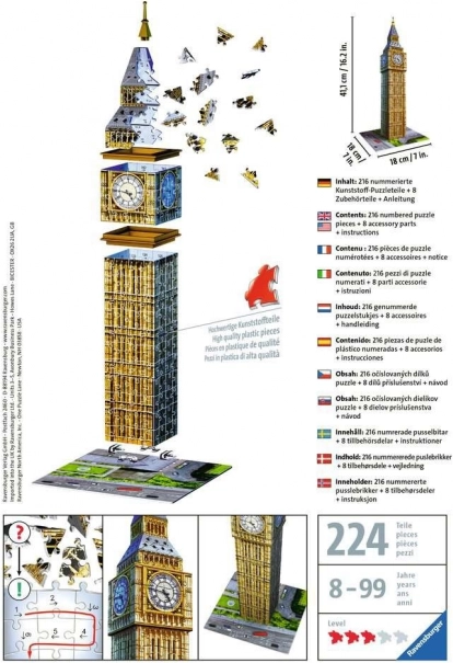 Zestaw zawiera łącznie 216 ponumerowanych elementów puzzli, 8 sztuk akcesoriów i szczegółową instrukcję. Po zakończeniu, puzzle mierzy około 18 x 18 x 41 cm. Ten model jest idealny zarówno dla fanów marki Ravensburger, jak i dla tych, którzy uwielbiają architekturę i Londyn.