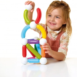Magnetyczna konstrukcja SmartMax Start Plus to idealny wybór dla małych odkrywców. Zestaw zawiera 30 elementów, w tym długie pałeczki, średnie pałeczki, zakręty i kulki łączące, które umożliwiają budowę prostych i skomplikowanych konstrukcji. Dzieci mogą próbować różnych 2D i 3D kształtów oraz budowli, takich jak wieże czy mosty.