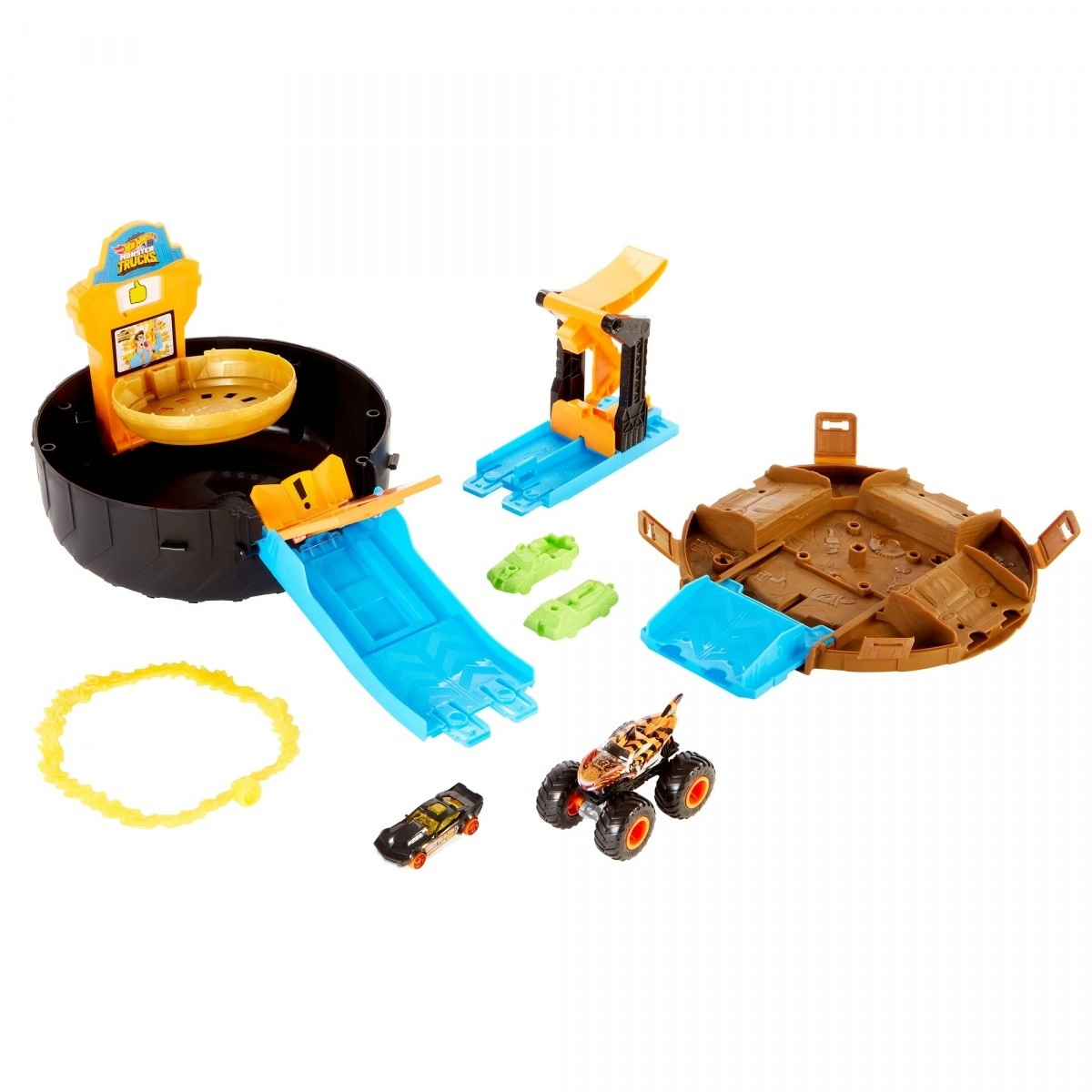 Przenośna kaskaderska arena w kształcie gigantycznej opony od Hot Wheels Monster Trucks zapewnia epickie skoki, zderzenia i rywalizację gdziekolwiek jesteś. Po rozłożeniu zestaw ma ok. 89 cm, zawiera wyrzutnię dla 2 autek lub 1 monster trucka, ognisty pierścień, tablicę wyników oraz strefę zwycięzców. W komplecie znajduje się Monster Truck Tiger Shark oraz autko Hot Wheels 1:64.
