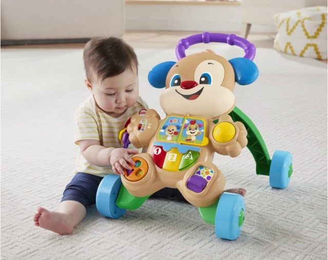Interaktywny chodzik w kształcie uroczego szczeniaczka to idealny towarzysz od pierwszego siedzenia aż po pierwsze samodzielne kroki. Dzieci odkrywają światła, dźwięki i piosenki, które zachęcają do ruchu i nauki. Stabilna rączka i szerokie koła wspierają równowagę, a panel aktywności rozwija motorykę małą i dużą.