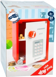 Zabawny i edukacyjny drewniany sejf marki small foot pomaga dzieciom odkrywać świat pieniędzy i bezpiecznego przechowywania skarbów. Sejf otwiera się na kombinację, ma obrotową tarczę z dźwiękiem i przyciski do naciskania. W zestawie bogate akcesoria – banknoty euro, złote i srebrne monety oraz drewniane sztabki złota. Idealny do zabawy w odgrywanie ról, rozwijania kompetencji finansowych i motoryki małej.