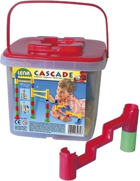Klocki Cascade przynoszą barwną kaskadę zabawy. Z 29 elementów można tworzyć różnorodne tory kulkowe, po których kulka mknie przez różne poziomy i przeszkody. Praktyczne wiaderko z uchwytem ułatwia przechowywanie i przenoszenie, dzięki czemu dzieci mogą bawić się w domu i w podróży.