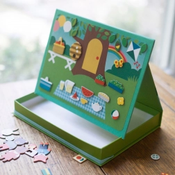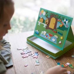 Magnetyczny teatr Zwierzęcy Dom Petit Collage daje dzieciom nieskończone możliwości łączenia i tworzenia scen – od przytulnego zwierzęcego domku po uroczy piknik w parku. Dzięki ogranicznikom magnetyczną scenę można łatwo ustawić, a pudełko w mgnieniu oka zamienia się w praktyczny teatrzyk.