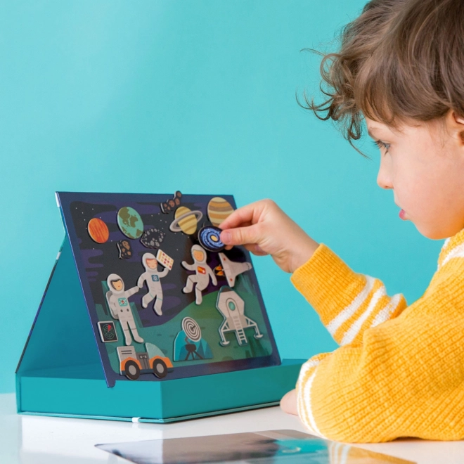 Magnetyczne teatrzyki kosmiczne oferują dzieciom nieskończone możliwości łączenia elementów i tworzenia scen na dwóch magnetycznych tłach – w przestrzeni kosmicznej i na stacji kosmicznej. Dzięki ponad 50 magnetycznym częściom mali odkrywcy mogą tworzyć oryginalne historie, rozwijać wyobraźnię i małą motorykę. Praktyczne pudełko ze stojakiem i blokadami umożliwia łatwe ustawienie sceny w dowolnym miejscu.