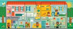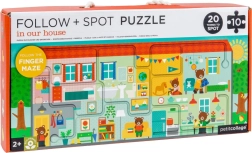 Odkryj sprytne puzzle dla dzieci z labiryntem, które rozwijają małą motorykę, uwagę i percepcję. Po ułożeniu 10 dużych elementów dzieci poprowadzą palec ścieżką i będą szukać 20 przedmiotów w kolorowym domku z misiami. Wykonane z papieru z recyklingu, drukowane tuszami roślinnymi i spełniają normy bezpieczeństwa. Idealne od 2 lat.