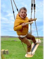 Solidne drewniane uchwyty na linach łatwo przesuniesz do idealnej wysokości. Zapewniają oparcie przy wsiadaniu i huśtaniu na stojąco.