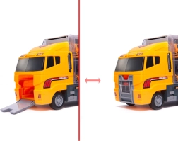 Ten zestaw 2 w 1 – transporter i zestaw do zabawy – łączy frajdę z praktycznością. Ciągnik z transparentnymi ściankami mieści sześć szczegółowo wykonanych pojazdów budowlanych, a jednocześnie służy jako kompaktowy organizer. Dzieci cieszą się realistyczną zabawą w budowę dzięki ruchomym częściom i sprytnej wysuwanej rampie na przycisk.