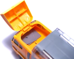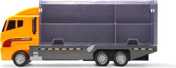 Ciągnik ma przezroczystą pokrywę i przegródki na wszystkie 6 autek. Dzieci mają pojazdy zawsze pod ręką, a zestaw łatwo się sprząta i przenosi.