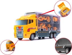 Duży zestaw dla małych budowniczych: solidny ciągnik siodłowy z przezroczystą pokrywą służy jako organizer i transporter dla 6 mini maszyn budowlanych (koparka, ładowarka, betoniarka itp.). Dzięki otwieranej masce i wysuwanej rampie autka łatwo wyjeżdżają po naciśnięciu przycisku. Zabawka wykonana z trwałego plastiku ABS, ma realistyczne detale i jest lekka do przenoszenia – idealna do domu, w podróż i do przedszkola.