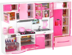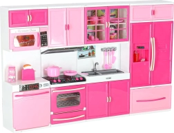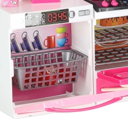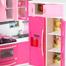 Stylowa różowo-biała kuchnia dla lalek składa się z czterech modułów z podświetlanymi palnikami LED i efektami dźwiękowymi. Oferuje otwierane drzwiczki, mikrofalówkę, piekarnik, zmywarkę, lodówkę oraz zlew i bogate akcesoria do realistycznej zabawy w gotowanie oraz organizację kuchni.
