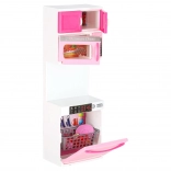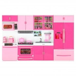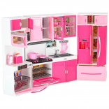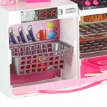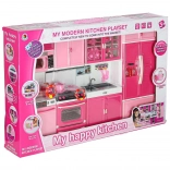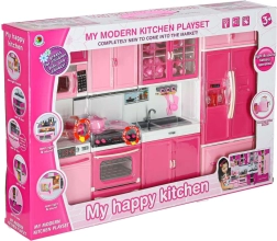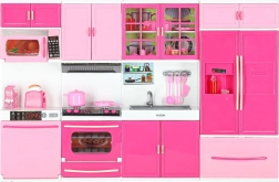 Zestaw obejmuje mikrofalówkę i zmywarkę, kuchenkę z piekarnikiem, witrynkę ze zlewem oraz lodówkę z szufladą. Dzieci cieszą się kompletnym scenariuszem gotowania, pieczenia i sprzątania.