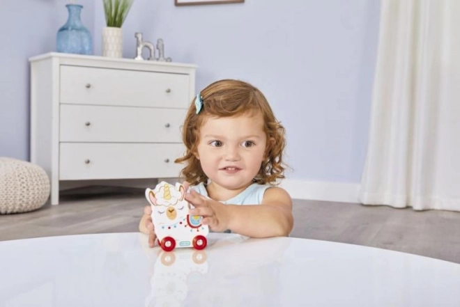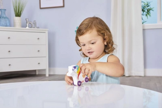 Zabawka ma cztery funkcjonalne kółka, które umożliwiają łatwą manipulację i poruszanie. Idealna do rozwijania motoryki dużej i wyobraźni dzieci już od 12 miesięcy.
