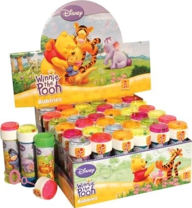 Bańki mydlane z motywem Kubusia Puchatka o pojemności 60 ml. W kolorowej nakrętce znajduje się gra oraz ustnik do dmuchania. Można kupić także jako cały display zawierający 36 sztuk.