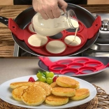 Ta wielofunkcyjna forma z silikonu do kontaktu z żywnością ułatwi przygotowanie śniadań i szybkich kolacji. Wystarczy położyć ją na patelni, wypełnić otwory ciastem i po ścięciu za pomocą bocznych uchwytów obrócić – uzyskasz równomiernie wypieczone i idealne kształty bez rozlewania ciasta.
