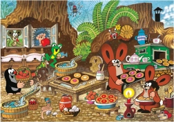 Wesoła ilustracja z Krecikiem i jego przyjaciółmi w kuchni jest pełna detali, które bawią dzieci i rozwijają ich wyobraźnię.