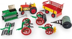 Zestaw zawiera traktor Zetor z plastikowymi felgami i mechanicznym mechanizmem sprężynowym, nakręcanym kluczem. Oferuje trzy różne prędkości do przodu, jedną prędkość do tyłu, neutralną pozycję oraz hamulec ręczny. Akcesoria obejmują: