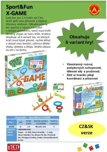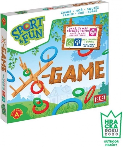 SPORT & FUN od ALEXANDER otrzymał tytuł Zabawka Roku 2020 w Czechach w kategorii OUTDOOR. X-GAME to dynamiczny zestaw, w którym rzucasz 3 kółkami o różnych średnicach na drewniany stojak w kształcie krzyża. Punkty zdobywasz w zależności od wielkości kółka i miejsca trafienia. Gra wspiera koordynację, równowagę i buduje zdrowe nawyki poprzez ruch.