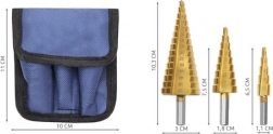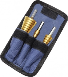 Uniwersalny zestaw wierteł stopniowych z wytrzymałej stali z powłoką tytanową do czystego i precyzyjnego wiercenia w blachach, PVC i metalu bez nawiercania wstępnego. Czytelna skala na każdym wiertle ułatwia dobór średnicy, sześciokątny chwyt 6 mm zapewnia pewne mocowanie, a praktyczne etui chroni wiertła podczas przenoszenia.