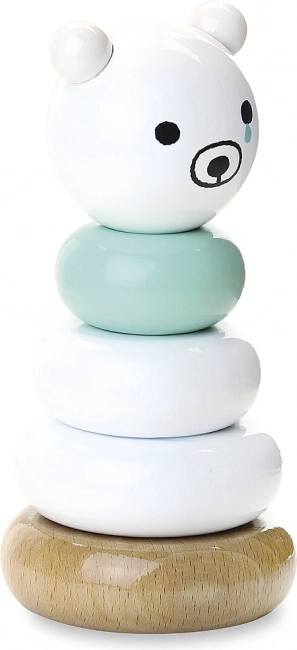 Ta elegancka wieża do nakładania z misiem w biało–miętowej kombinacji i naturalnym drewnianym wykończeniu to idealna pierwsza edukacyjna zabawka. Dzieci ćwiczą prawidłowe układanie krążków, rozróżnianie rozmiarów i rytm ruchów, a stonowane kolory i uroczy wyraz misia pobudzają ciekawość i sprzyjają spokojnej zabawie.