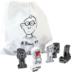 W zestawie znajduje się tekstylny worek z motywem KEITH HARING do bezpiecznego i łatwego przenoszenia oraz przechowywania figur.