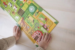 Zabawne i edukacyjne puzzle dla najmłodszych. Ułóż 10 dużych elementów i podążaj palcem po labiryncie przez farmę. Dzieci podczas zabawy rozwijają małą motorykę, koncentrację i spostrzegawczość, gdy szukają 20 różnych przedmiotów na ilustracji. Puzzle wykonano z papieru z recyklingu i zadrukowano farbami na bazie roślin, spełniają surowe standardy bezpieczeństwa i są idealne dla dzieci od 2 lat.