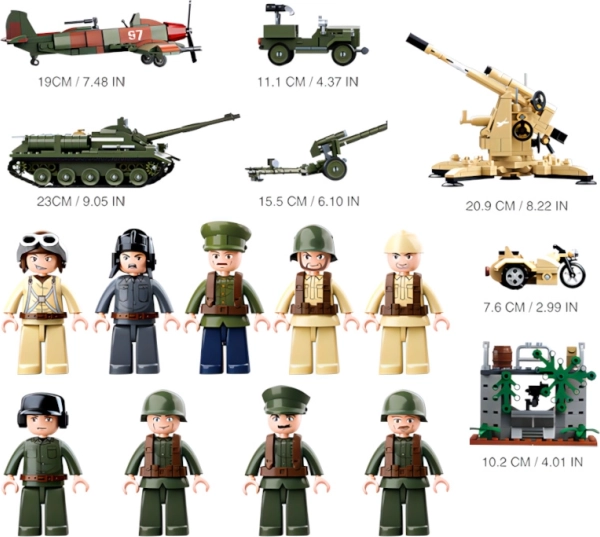 Zbuduj czołg, samochód terenowy, samolot, motocykl oraz artylerię. Realistyczne detale i ruchome części pozwolą tworzyć emocjonujące scenariusze bitewne.