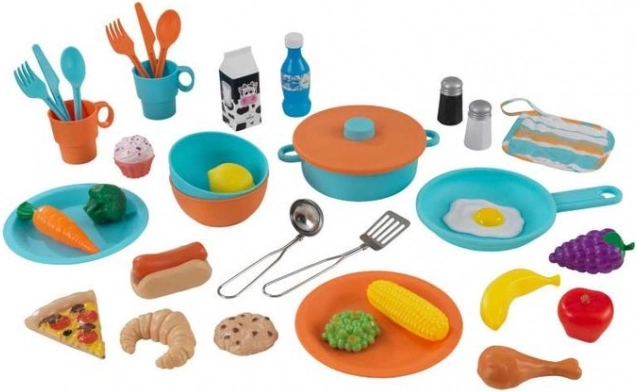W zestawie znajduje się 38 sztuk naczyń, produktów spożywczych i przyborów kuchennych. Dzieci mogą od razu serwować, mieszać, kroić i odkrywać nowe przepisy.