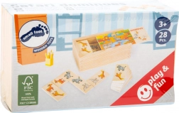 Pozwól dzieciom odkrywać świat zwierząt dzięki stylowemu i wytrzymałemu domino z 100% certyfikowanego drewna FSC. Duże elementy z motywami safari są idealne dla małych rączek, wspierają małą motorykę i logiczne myślenie. Praktyczne drewniane pudełko ułatwia przechowywanie i przenoszenie.