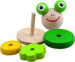Huśtająca piramida żabkowata to świetna drewniana zabawka do rozwoju motoryki i wyobraźni małych dzieci. Składa się z 4 nakładanych części i jednej podstawowej drewnianej części z patykiem, dzięki czemu wesoło się chybocze i kręci.