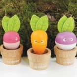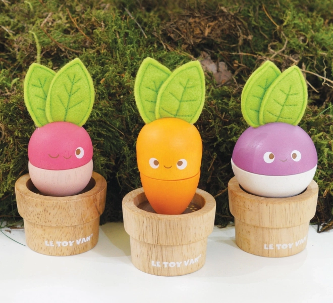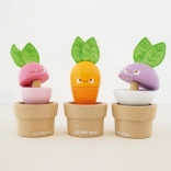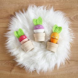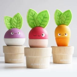 - 3 drewniane doniczki, warzywa z wymiennymi elementami (marchewka, rzodkiewka, burak) z filcowymi listkami