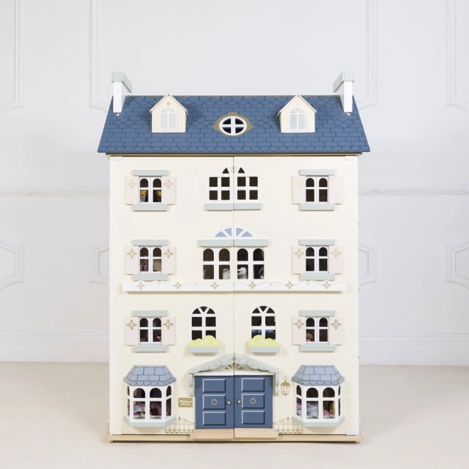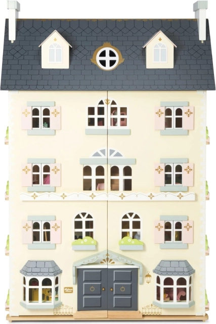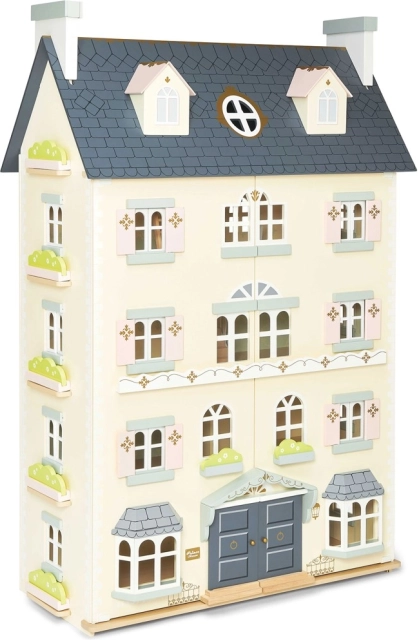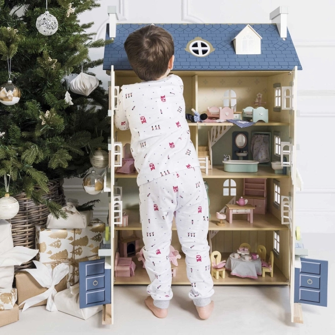Pałacowy domek dla lalek LE TOY VAN to wyjątkowa zabawka i designerski obiekt w jednym. Z każdej strony znajdziesz liczne okna, niektóre można otwierać, podobnie jak piękne drzwi wejściowe w królewskim błękicie. Osiem stylowych pokoi zdobią eleganckie dekoracje ścienne, a duża centralna klatka schodowa sięga aż do czwartego piętra. Odłączany dach odsłania przestronny strych dostępny po drabince – idealny do odgrywania scenek i jako kącik do przechowywania.