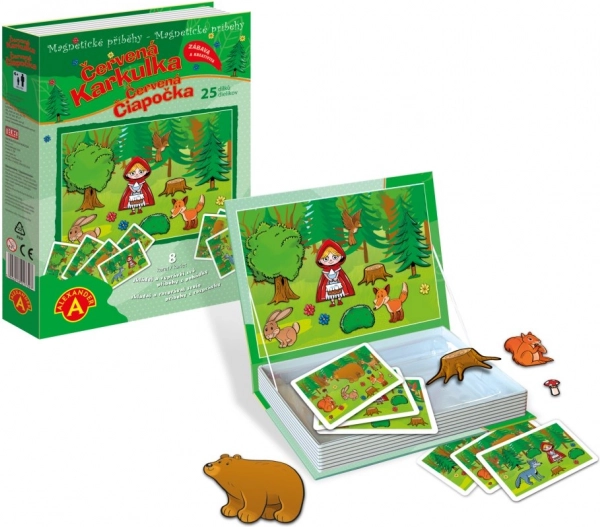 Odkryj zabawny świat magnetycznych opowieści z motywem Czerwonego Kapturka. Dzieci układają obrazkowe magnesy na magnetycznym tle według wzorów na kartach lub tworzą własne kombinacje i historie. Gra działa również jak mały magnetyczny teatrzyk, który naturalnie rozwija fantazję i umiejętności komunikacyjne.