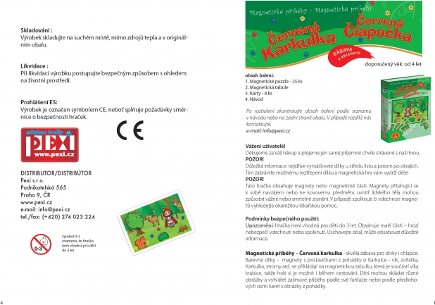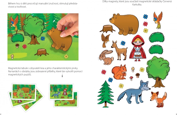 Magnetyczne elementy łatwo przyczepiają się do tablicy, dzięki czemu wszystko pozostaje na swoim miejscu także podczas przenoszenia. W zestawie znajdują się karty z przykładami opowieści oraz instrukcja w języku czeskim i słowackim, aby dzieci mogły bawić się samodzielnie lub z rodzicami czy nauczycielami.