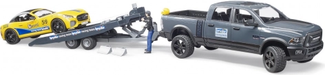- Terenowy pick-up RAM, przyczepa, żółty samochód sportowy, figurka kierowcy, dodatkowa kierownica