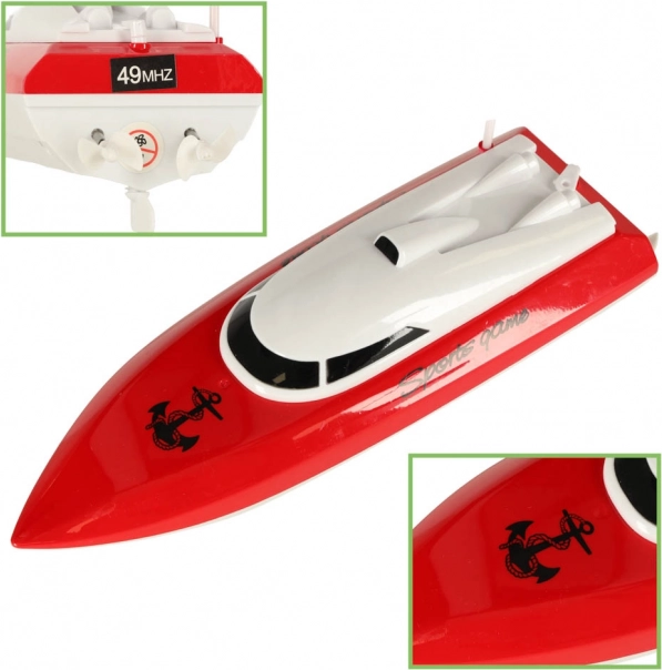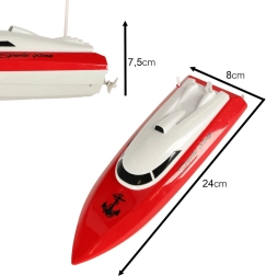W zestawie znajduje się wszystko, co potrzebne do uruchomienia: łódź, pilot zdalnego sterowania, ładowarka sieciowa, akumulator oraz antena. Pilot wygodnie leży w dłoni i do pracy wymaga 2× AA 1,5 V (brak w zestawie). Kompaktowe wymiary 24 × 8 × 7,5 cm ułatwiają przenoszenie i przechowywanie.