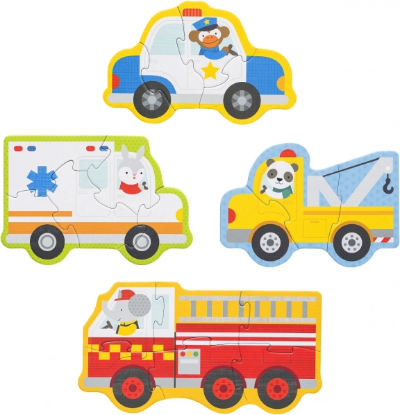 Zapoznaj dzieci ze światem ratowników za pomocą sympatycznych ilustracji – królik prowadzi karetkę, małpka radiowóz, słoń wóz strażacki, a panda lawetę. Różne poziomy trudności układanek (3, 4, 5 i 6 elementów) wspierają stopniowy rozwój umiejętności, cierpliwość i radość z sukcesu.