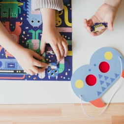 Po ułożeniu obrazka czeka małych detektywów zadanie: czy znajdą 5 słodkości, 4 przedmioty na kółkach, 3 nakrycia głowy, 2 instrumenty muzyczne i 1 śmierdzącą rzecz? Dzięki wysokiej jakości materiałom z certyfikowanego papieru FSC oraz nadrukowi nietoksycznymi farbami zabawa jest bezpieczna i przyjazna środowisku.