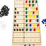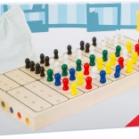 • Plansza i pionki: Gra składa się z drewnianej planszy z otworami i kolorowych pionków, które oferują różne kombinacje kolorystyczne.