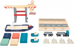 Ta przemyślana portowa konstrukcja zapewnia dzieciom realistyczną zabawę w logistykę: statek z dwoma holownikami jest gotowy do wypłynięcia, a dźwig przeładowuje kolorowe kontenery dzięki zintegrowanym magnesom. Solidne drewniane elementy i płynnie działające funkcje wspierają motorykę małą, wyobraźnię i cierpliwość.