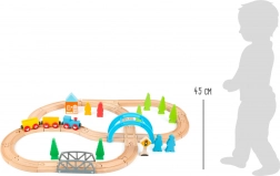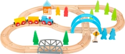 Zestaw obejmuje lokomotywę z wagonikami, most, domek, drzewa, figurki i elementy drogowe do realistycznych scenariuszy. Naturalne drewno w połączeniu z wyrazistymi kolorami prezentuje się atrakcyjnie i wspiera percepcję sensoryczną. Dzięki kompatybilności z innymi drewnianymi systemami dzieci mogą łatwo rozbudowywać świat torów.