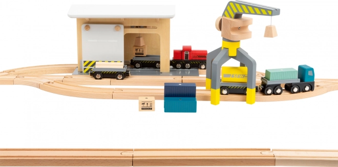 Ten bogato wyposażony drewniany zestaw wprowadza dzieci w autentyczny świat kolei towarowej. Obrotowy dźwig łatwo przenosi magnetyczne klocki i kontenery, przesuwna ściana z wbudowanym bloczkiem umożliwia elastyczną obsługę, a pociąg z magnetycznymi wagonikami rozwozi towary po zróżnicowanej trasie z 25 elementów. Całość wykonana z certyfikowanego drewna FSC dla trwałości i bezpiecznej zabawy.