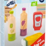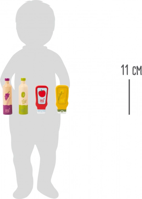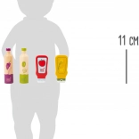 Każda buteleczka ma wyraziste ilustracje (olej, ocet, ketchup, musztarda), dzięki którym dzieci łatwo rozpoznają zawartość i włączą je do zabawy w gotowanie.